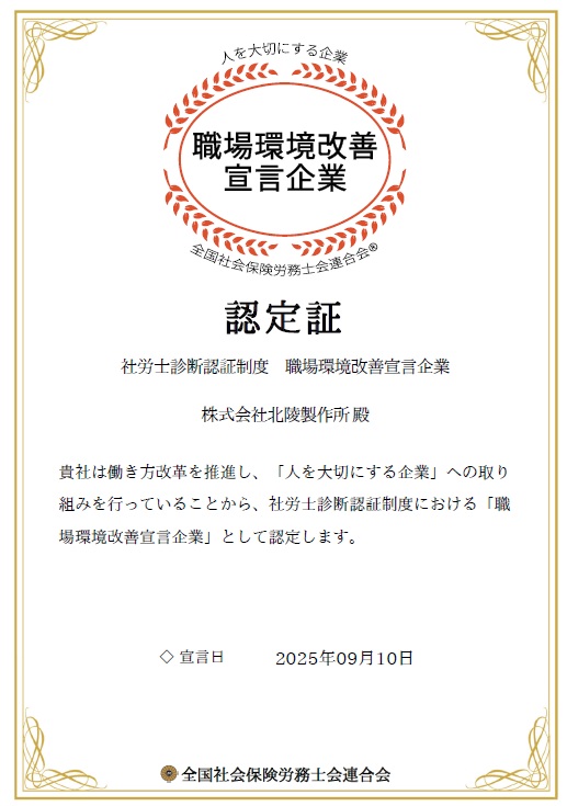 CSR 職場環境改善宣言 2025.09.10 このたび、全国社会保険労務士会連合会が実施している社労士診断認証制度の「職場環境改善宣言企業」認定を受けました。 これからも人を大切にする企業であり続けるため、労務コンプライアンスや職場環境改善に積極的に取り組み、働きやすい企業を目指してまいります。 Post シェア 夏季休業のお知らせ いわて働き方改革推進運動